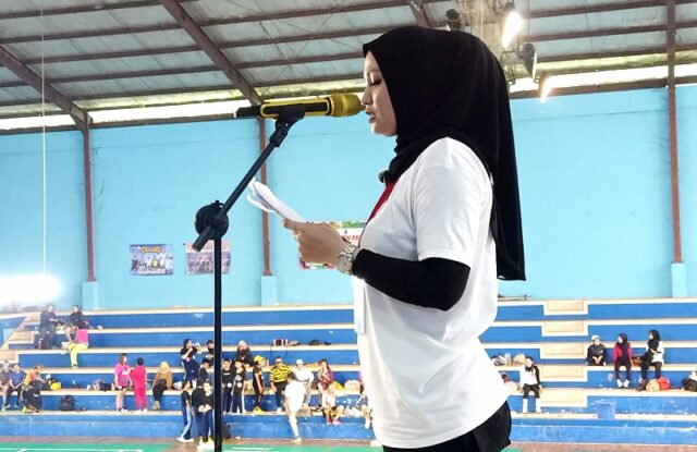 Ket foto : Ketua panitia pelaksana kegiatan Aerobic Competition dan Zumba Party Open Competition Kalimantan, Jhenny Herlena sampaikan laporan kegiatan di GOR Panglima Batur Muara Teweh, pada Minggu 20 Agustus 2023.(foto: FK)