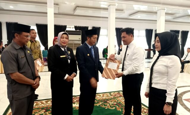 FAKTA5, MUARA TEWEH – Penjabat (Pj) Bupati Barito Utara, Drs Muhlis menyerahkan 64 Surat Keputusan (SK) Bupati Barito Utara tentang pengangkatan Pegawai Pemerintah Dengan Perjanjian Kinerja (PPPK) Tenaga Teknis Tahap Optimalisasi, di gedung Balai Antang Muara Teweh, Kamis 2 November 2023.