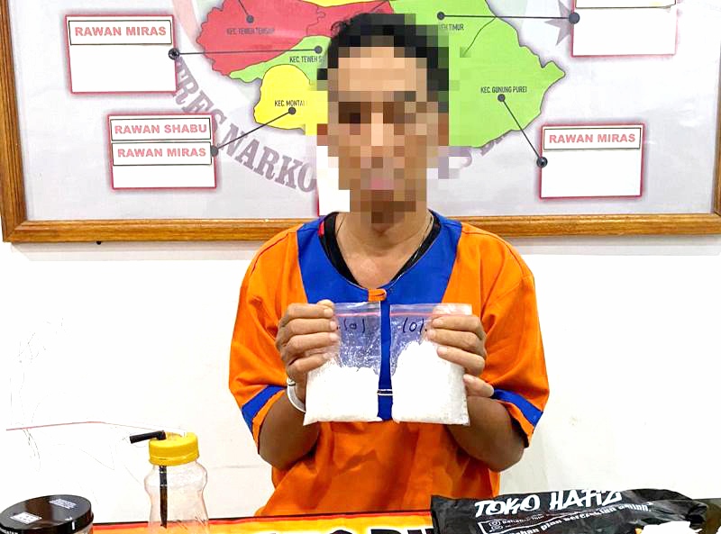 “Saat anggota melakukan penggeledahan di rumah barak di Jalan Beringin Gang Buntu, dari tangan pelaku ditemukan barang bukti 3 buah plastik klip besar bening berisi serbuk kristal putih yang diduga narkotika jenis sabu dengan berat total 181,48 gram bruto,” kata kasat Narkoba Iptu Arie Indra Susilo.