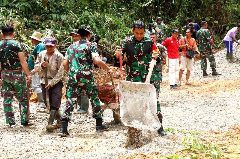 Tanpa ada basa basi, Dansatgas langsung ikut bergabung dengan anggota satgas dan masyarakat untuk mengangkat material batu untuk menimbun jalan sebelum jalan diperkeras.