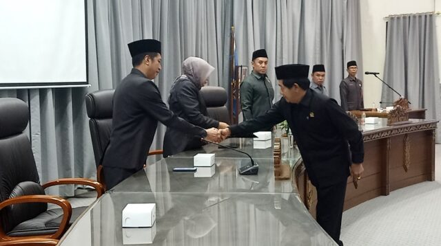 Juru bicara fraksi Partai Demokrat DPRD Barito Utara, Edi Fran Aji menyerahkan pemandangan umum fraksi terhadap Raperda Pengelolaan Persampahan pada rapat paripurna II DPRD, di gedung DPRD setempat, Senin 3 Juni 2024.(foto: FK)