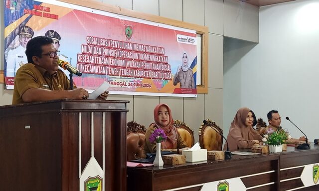 FAKTA5, MUARA TEWEH – Dinas Koperasi dan UKM Provinsi Kalimantan Tengah bekerjasama dengan Dinas Tenaga Kerja, Transmigrasi, Koperasi dan UKM (Disnakertranskop UKM) Kabupaten Barito Utara menggelar kegiatan sosialisasi/penyuluhan memasyarakatkan nilai dan prinsip koperasi untuk meningkatkan kesejahteraan ekonomi wilayah perhutanan sosial Kabupaten Barito Utara tahun 2024 di aula Kecamatan Teweh Tengah, Senin 24 Juni 2024.