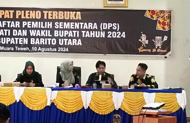 FAKTA5, MUARA TEWEH – Komisi Pemilihan Umum (KPU) Kabupaten Barito Utara menggelar rapat pleno terbuka penetapan Daftar Pemilih Sementara (DPS) Pemilihan Kepala Daerah (pilkada) di aula BappedaLitbang Muara Teweh, Sabtu 10 Agustus 2024.