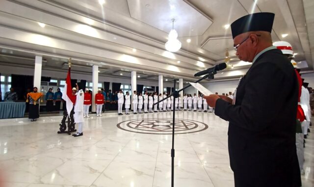 FAKTA5, MUARA TEWEH – Sebelum dikukuhkan oleh Pj Bupati Barito Utara Drs Muhlis, terlebih dahulu anggota Pasukan Pengibar Bendera Pusaka (Paskibraka) Kabupaten Barito Utara tahun 2024 membacakan ikrar anggota Paskibraka.