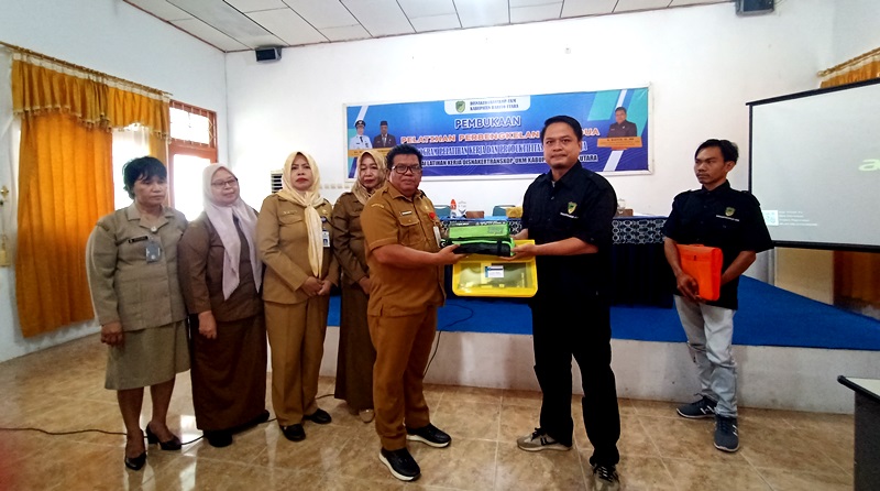 Kepala Dinas Nakertranskop UKM Barito Utara, M Mastur didampingi Kabid dan pejabat fungsional menyerahkan materi pelatihan perbengkelan roda dua di aula dinas setempat, Selasa 27 Agustus 2024.(foto: FK)