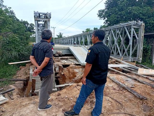 Kepala Dinas PUPR Barito Utara, M Iman Topik bersama Kepala Bidang Bina Marga saat meninjau pembangunan jembatan bailey bentang 35 meter (B35M) di Desa Jamud Kecamatan Teweh Timur.(foto: FK)