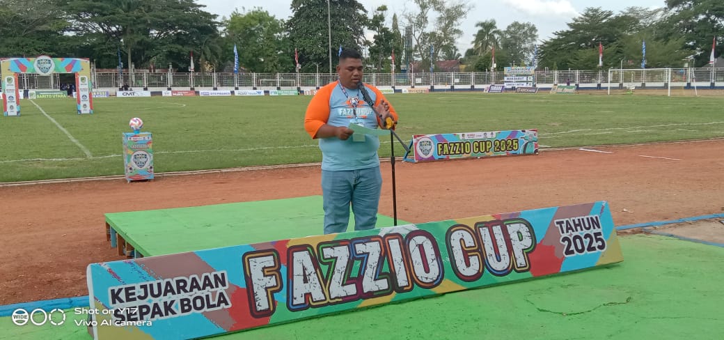 Ketua Panitia Pelaksana, Dedy Suryana saat menyampaikan laporan pada pembukaan kejuaraan sepak bola Fazzio Cup 2025 di stadion Muara Teweh.(foto: FK)