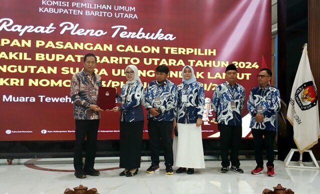 FAKTA5, MUARA TEWEH – Komisi Pemilihan Umum (KPU) Kabupaten Barito Utara menggelar Rapat Pleno Terbuka Penetapan Pasangan Calon Terpilih Bupati dan Wakil Bupati Barito Utara Tahun 2024 di Gedung Balai Antang Muara Teweh, Sabtu 20 September 2025.