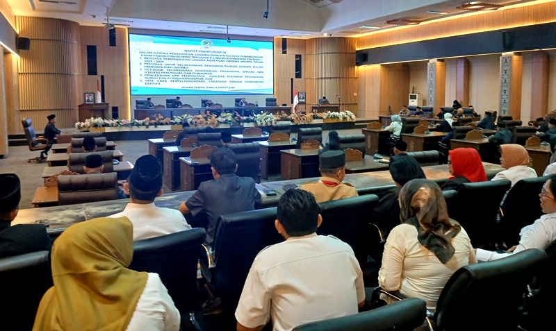 DPRD Barito Utara menggelar rapat paripurna III masa sidang I dengan agenda penyampaian jawaban pemerintah daerah terhadap lima raperda, di gedung DPRD setempat, Rabu 4 Maret 2026.(foto: FK)